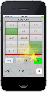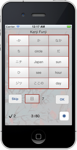 On the top of the page there are 15 cards showing English translations and Kana. Below the cards you see the Kanji to learn. Next to the Kanji you find the required number of cards to tap. Tap the cards with the (hopefully) correct Kana and translation(s) and then tap on "OK". The chosen cards are now displayed dark green. Rising stars appear if everything is correct. Otherwise the missing cards are displayed in light green, the wrong ones in red.