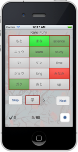 KanjiFunji offers a Game Mode to challenge your knowledge. Here you have to tap all correct cards in a given time frame. The amount of time depends on the number of cards to tap for each Kanji.